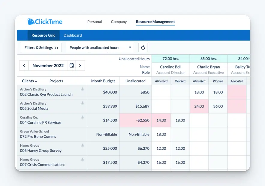 ClickTime also takes all of your historical data and pairs it with your future plans to help you understand how many employee hours new projects will take to complete, how the hours you’ve worked compare to the hours you estimated you’d need, and how much work each member of your team is assigned.