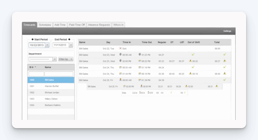 - Mobile, web, and kiosk modes for clock-ins across different work environments