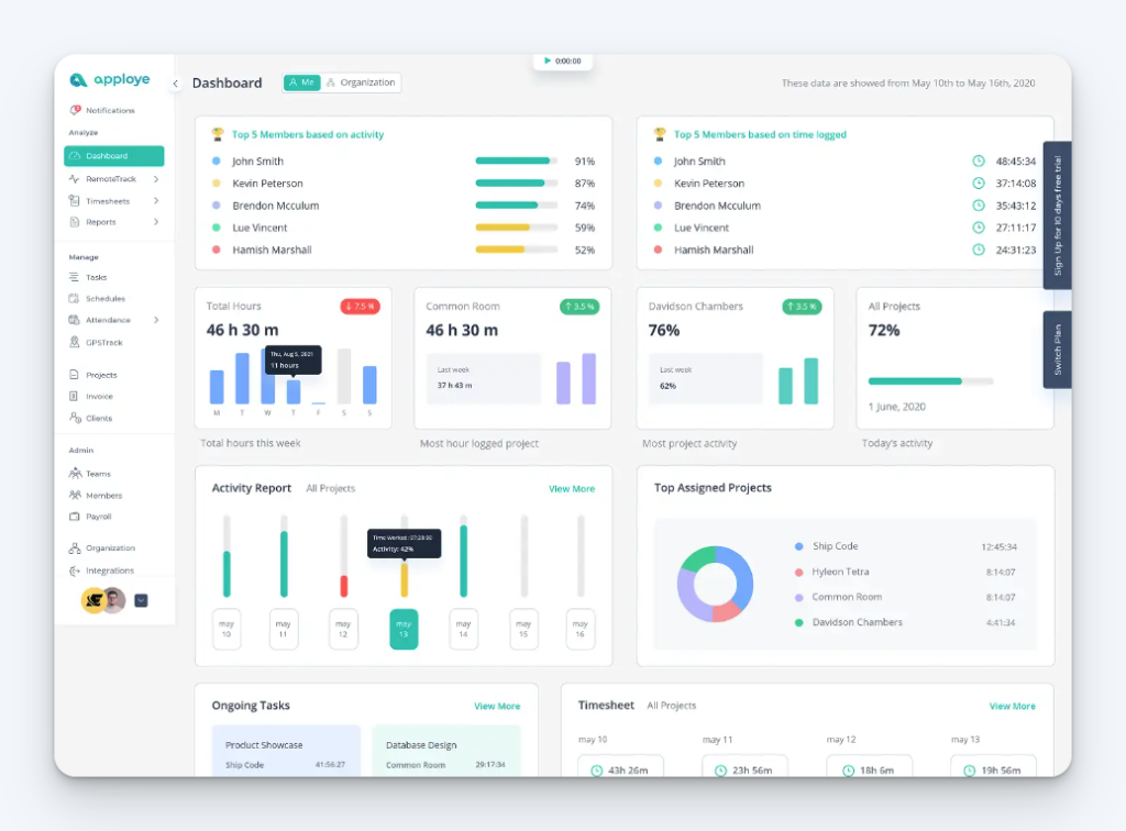 Apploye is easy to roll out with a free plan for up to 10 users and affordable paid plans. Low-cost but effective add-ons give you flexible pricing. Moreover, the UI is modern and simple for the fast onboarding of your employees.
