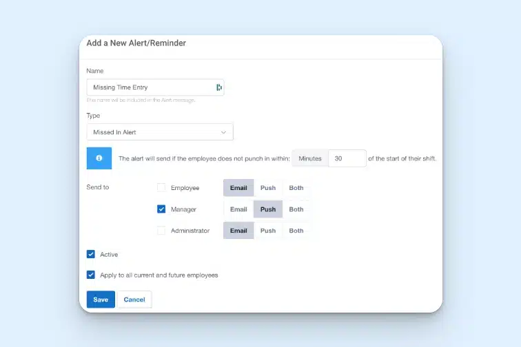 You can make this process even more automatic using Buddy Punch. For instance, you can set up alerts when workers don’t clock into a shift at the scheduled time. Managers can then quickly check what’s happening: Is the employee just late to work, or did they forget to clock in?