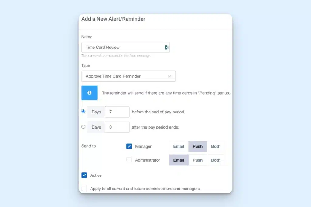 Software can make this task simpler. With Buddy Punch, you can set up automated reminders to nudge managers to approve time cards.