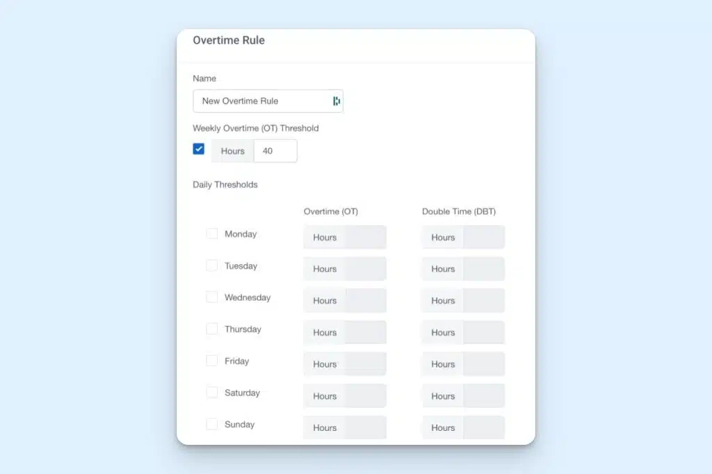 Complement this with a digital time tracking tool, which keeps track of overtime without any human effort. In Buddy Punch, you can set up custom overtime rules and define the number of hours at which an employee hits overtime. Any overtime rate then gets automatically applied to their pay.
