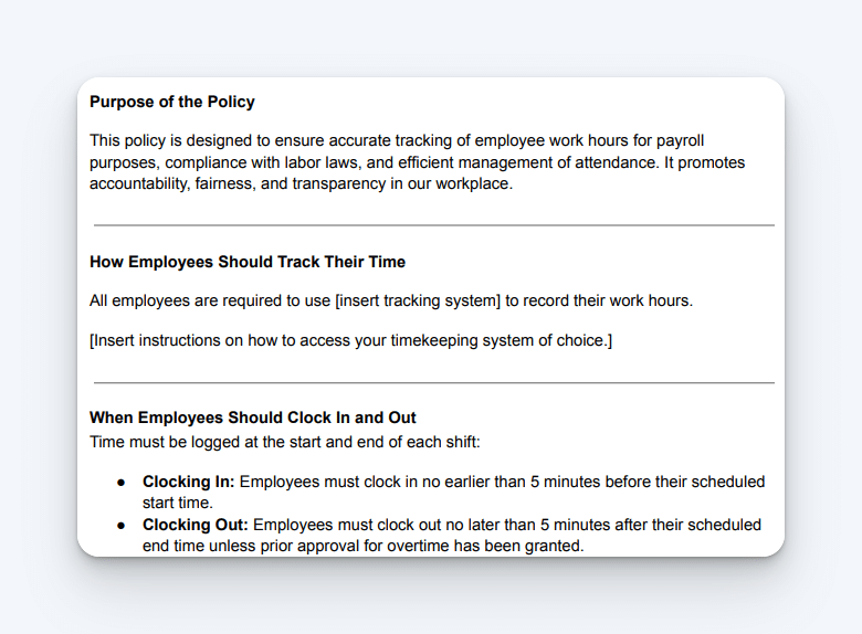 It’s always helpful when your employees understand why you have certain policies in place, and having a “Purpose” section in your timekeeping policy gives you a place to do that.